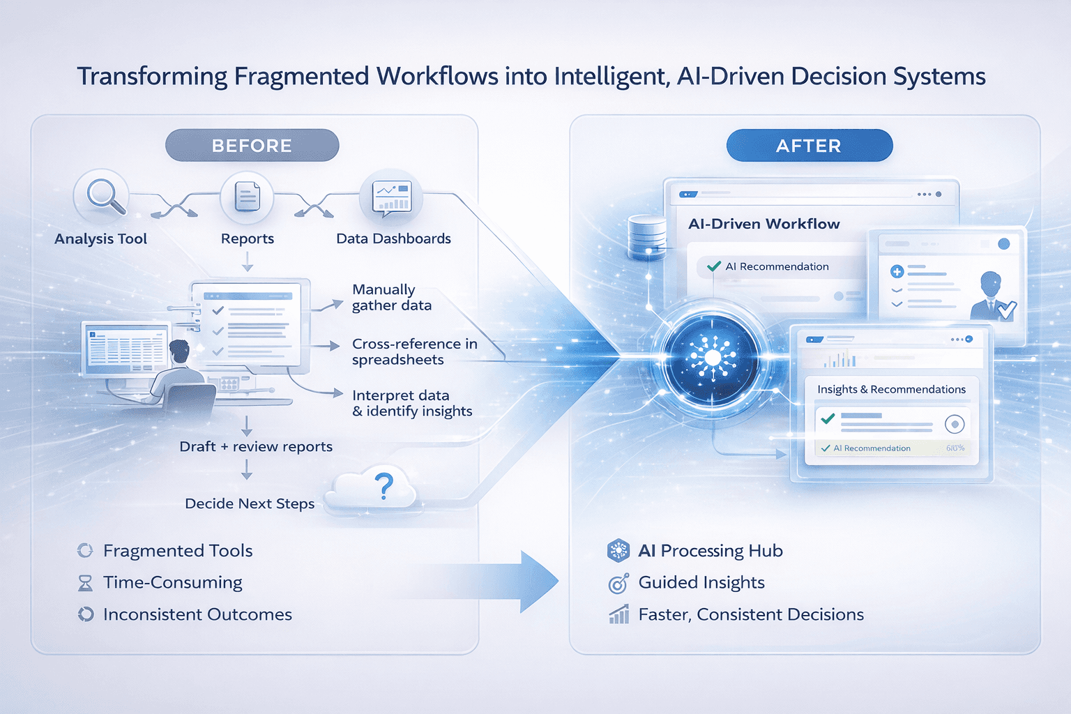 The visual illustrates the "Before and After' workflow of the AI-driven insights platform. By integrating AI into key user journeys, we accelerated decision-making, increased trust in insights, and helped achieve meaningful business results.