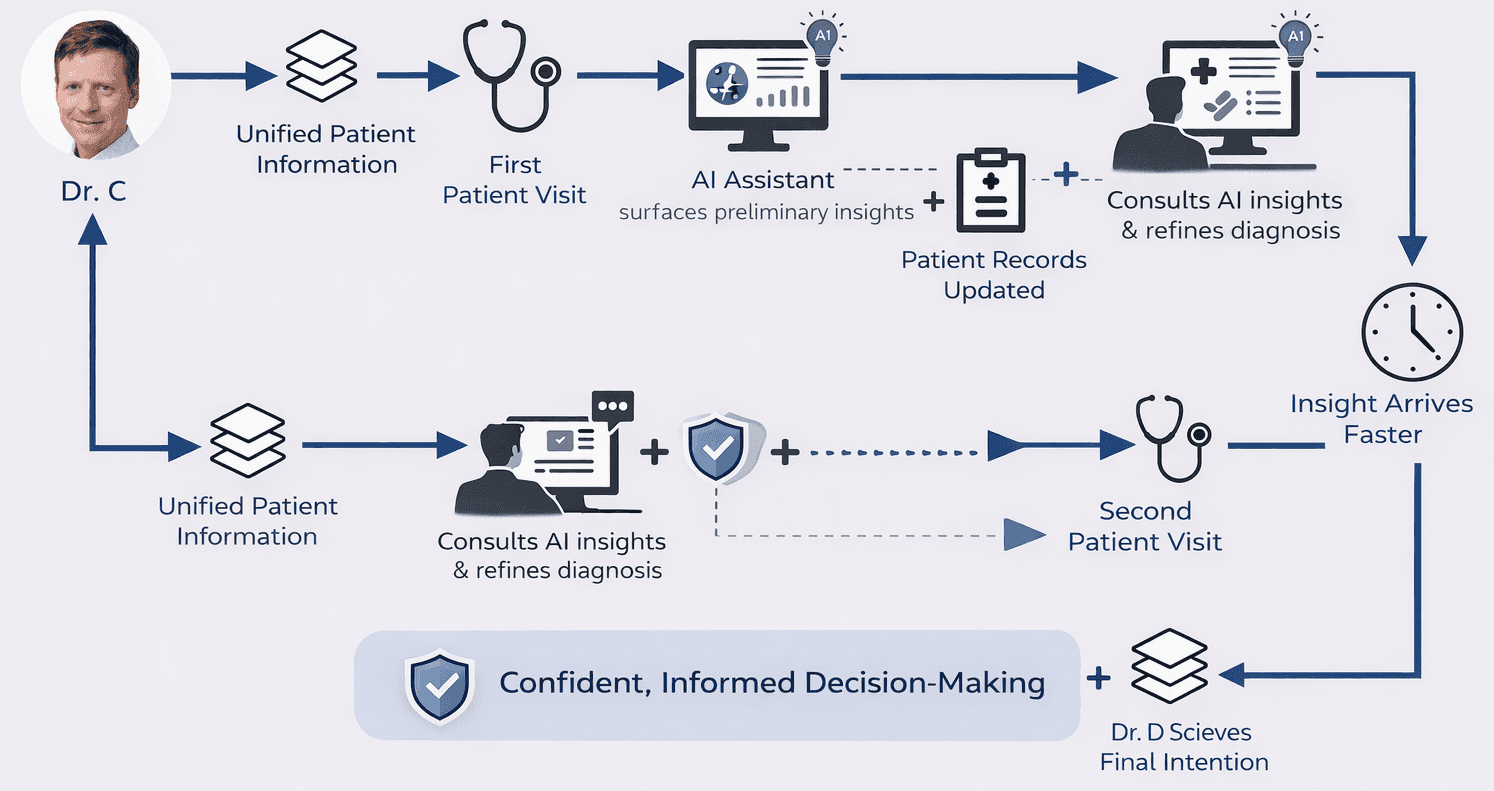 Healthcare organizations were investing in AI-driven diagnostics, but existing products lacked a clear strategy for integrating these capabilities into clinician workflows. Clinicians were forced to navigate fragmented systems, manually interpret complex data, and make critical decisions without cohesive support, thereby limiting both efficiency and AI adoption.